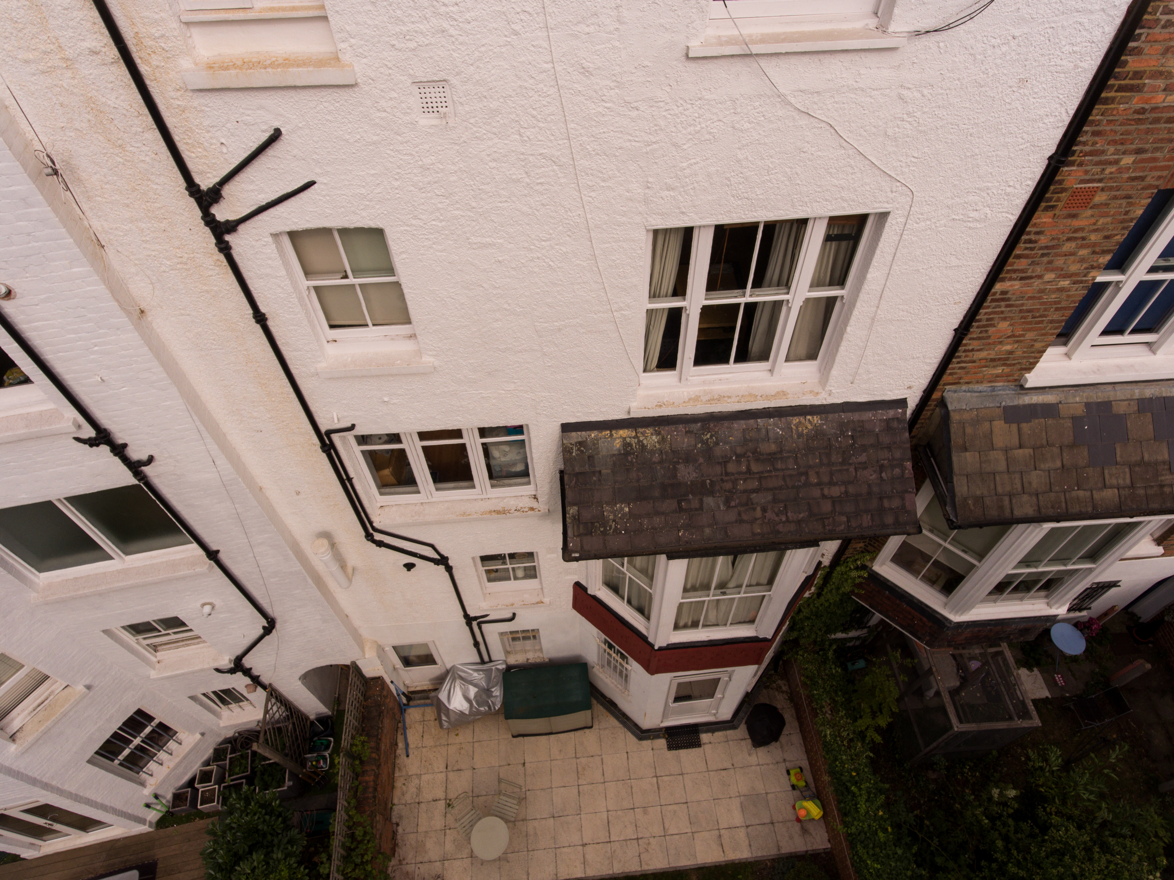 SkyCam was recently asked to survey the roof of this 3-storey property to try and discover where the water staining (seen on the LHS white faced wall) was coming from. This required a drone roof inspection.